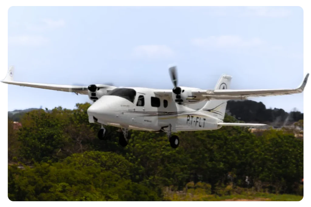O Tecnam P2006T é uma aeronave bimotor leve, amplamente utilizada para treinamento de voo multimotor devido à sua eficiência operacional e modernos sistemas embarcados. Seu trem de pouso retrátil e painéis digitais tornam a experiência de voo ainda mais próxima da realidade de aeronaves comerciais.